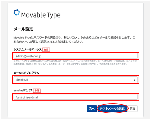| sendmailのパス | 「/usr/sbin/sendmail」と入力 |