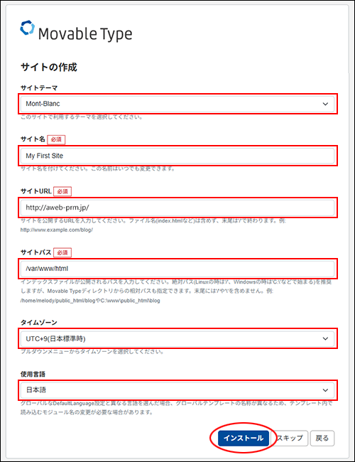 | サイトパス | 「/var/www/html」を入力します。 |