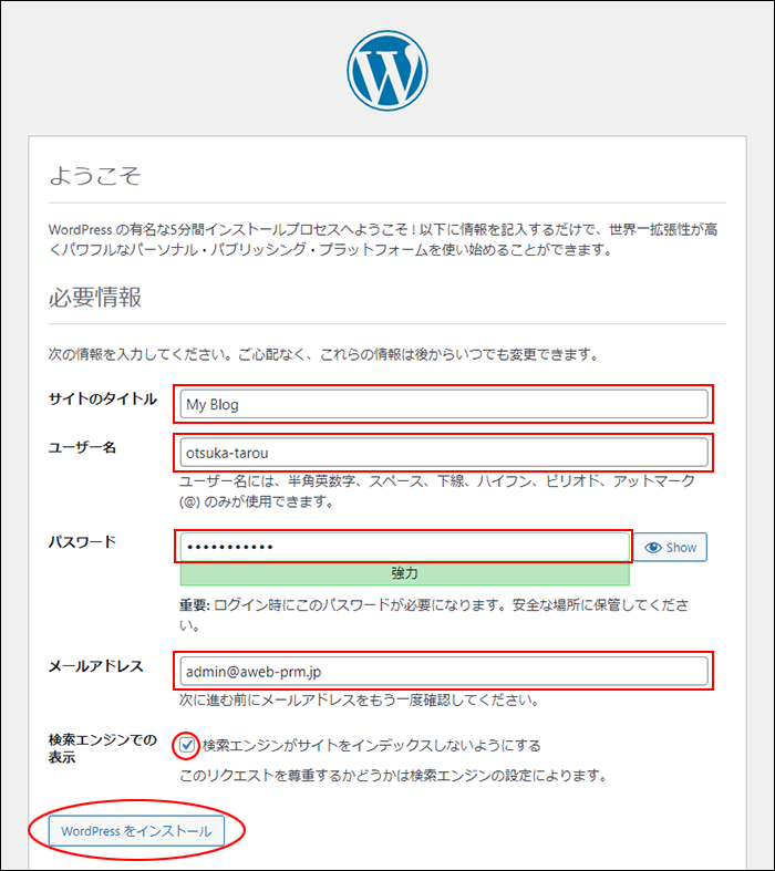 必要事項を入力し、「WordPress をインストール」をクリックします。
