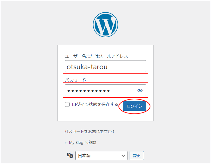 WordPressの管理画面が表示されます。