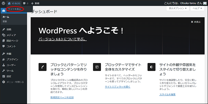 画面左上、サイトのタイトルをクリックし「サイトを表示」をクリックします。